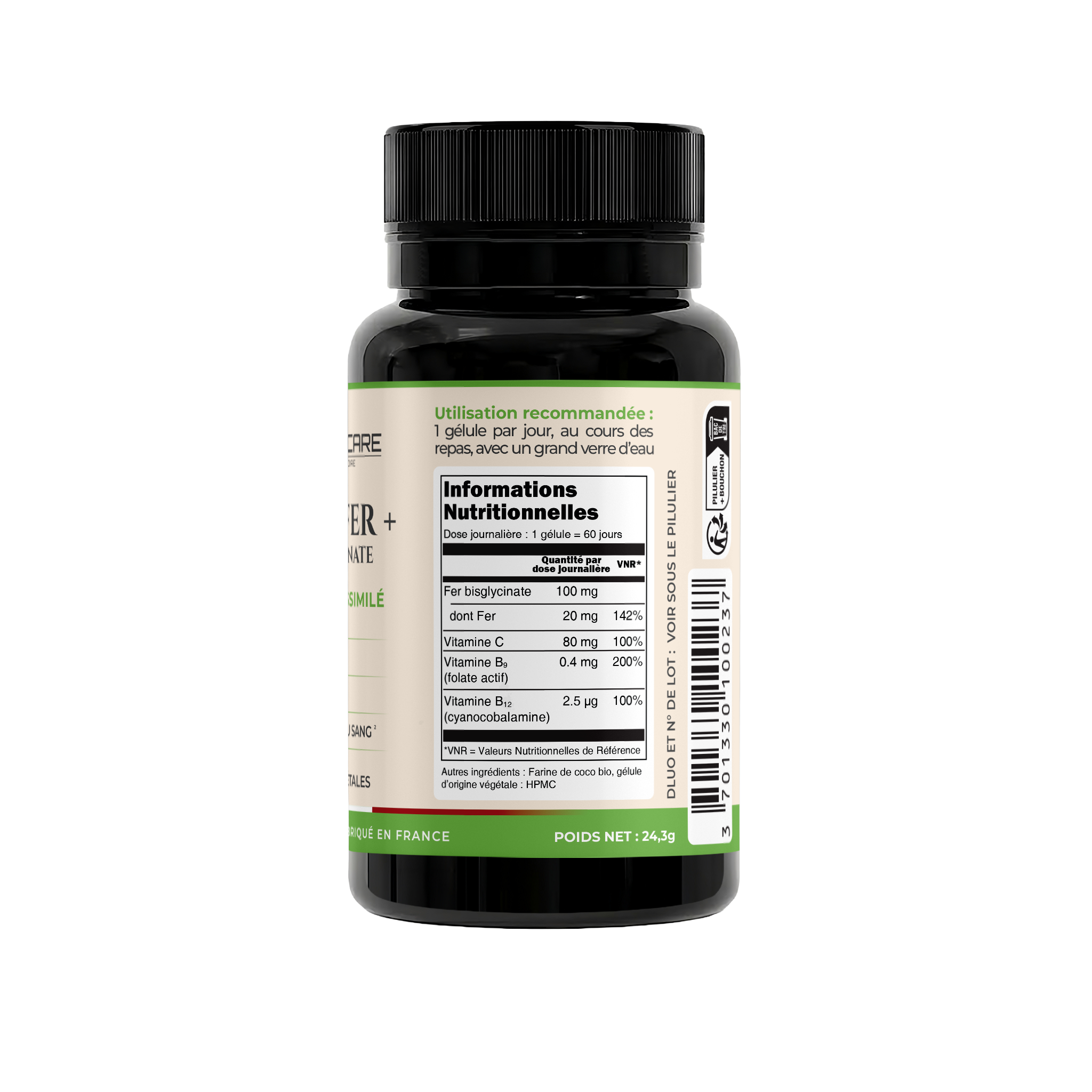 Liste complète : Fer bisglycinate, Vitamine C, Vitamine B9, Vitamine B12. Agent de charge : Farine de coco bio. Enveloppe : Gélule végétale (HPMC). Garanti Sans Gluten, Sans OGM, Vegan.
